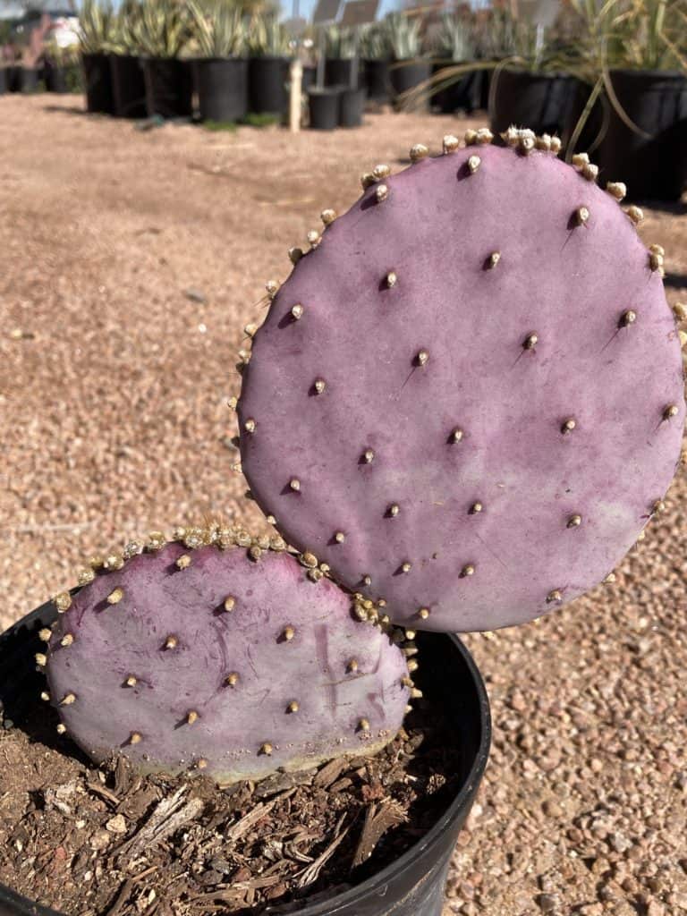 Opuntia violacea var. santa rita (Purple prickly pear). Sunset: 8-10, 12-24; USDA: 7-10. Full sun. Heat tolerant. Little to no water. Hardy to 0°F. Grows to 5′. Origin: Texas to Arizona, northern Mexico